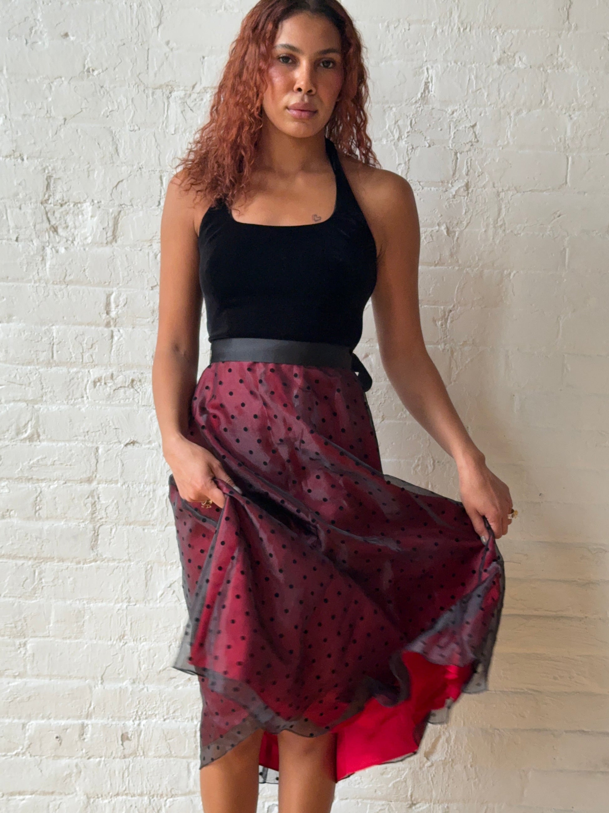 A true vintage moment that feels straight out of a 90s holiday editorial. This Betsy & Adam dress features a sculpted black velvet bodice that contrasts beautifully against a sheer polka dot overlay, layered over a rich red satin base. The movement on this piece is unreal — light, fluid, and designed to catch attention with every step.